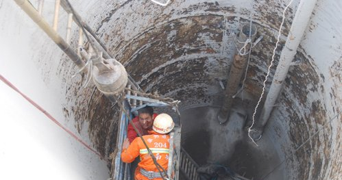 約20分鐘后,南安水頭消防中隊(duì)接警趕到,消防指揮員協(xié)調(diào)調(diào)度一輛吊機(jī)過來,并派3名隊(duì)員沿扶梯下到罐底。