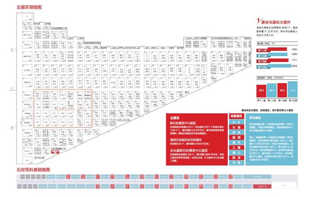 ①新石材展覽中心展區,設有國際標準展位4017個,展示面積6.8萬平方米。其中主展館館內國際標準展位2971個,展示面積5.5萬平方米,室外展區1046個,展示面積1.3萬平方米。展位組團規劃有國際展團、精品石材展團及石材機械展團;