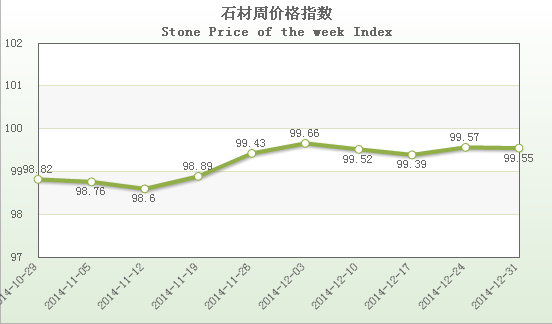 據監測,“中國·水頭石材指數”20141231期石材周價格指數收報于99.55點,環比略微下調約0.03點,下調0.03%。本周石材價格指數與上周相比幾乎持平,價格穩中略微下調。大部分石材價格趨于穩定,部分石材產品受質量變化及市場行情影響,價格略微調整、正常浮動。