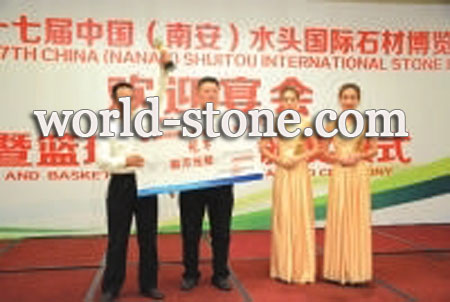 中國石材協會秘書長齊子剛、福建省石材行業協會會長王伯瑤、泉州市石業商會會長王尚云、南安市石材協會會長王清安、南安水頭鎮商會會長黃明經、南安市石材外經貿協會會長呂少友等出席了頒獎儀式。儀式由王清安主持,齊子剛、王伯瑤、王尚云、黃明經、呂少友等分別為冠亞季軍、殿軍及“最佳球隊人氣獎”這5支球隊頒獎。
