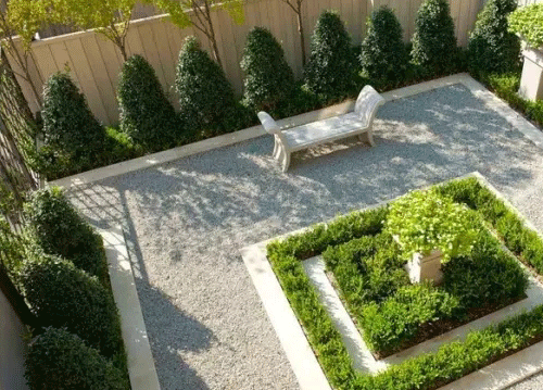 散鋪礫石是英式自然庭院中最常見的一種鋪裝方式,在鋪設時請注意選用沒有尖銳角的豆石,避免對皮膚的割傷。