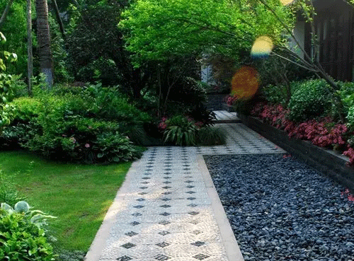 花園中一條河卵石小徑給空間增加了靈動的變化。白色卵石上一個“若”字帶來禪的意境。此類鋪裝較為節省施工成本,缺點是表面不平整有崴腳的危險,所以有老人和孩子的家庭建議不用。如果喜歡,那么在鋪設的時候,卵石周邊的混凝土與卵石頂端的高差最好小于2~3厘米。