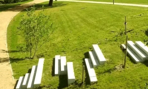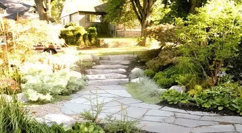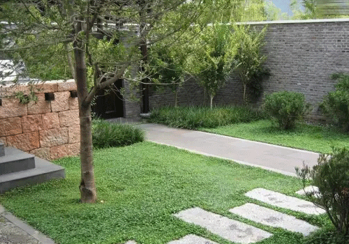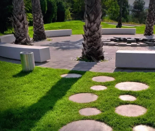 此類鋪裝屬于汀步的一種,是浮擺在草地上的做法。由于草地在雨雪后或者澆灌以后很松軟濕滑,所以用汀步的方式可以避免踩傷草坪或者沾濕鞋子。這也算是最節省成本的道路鋪裝方式。此例中,對于花盆和水泥磚都進行了彩繪處理,實在是相得益彰的設計。
