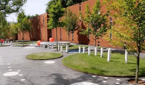 碎拼地面圖案可以隨心所欲的變化,色彩也可以大膽使用。需要注意的是,在雨雪天氣此類地面會造成嚴重的濕滑,很容易造成摔傷。在室外使用的鋪裝材料一定要經過防滑處理。