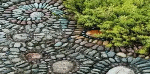模板大地藝術做出的螺旋紋樣給空間增加了很多神秘感和趣味性,其實在石子散堆的螺紋部分,可以只堆放石子,還可以散鋪玻璃球、貝殼、糖果等讓人意想不到的裝飾物,讓庭院更加藝術生動起來。