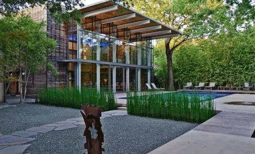 在一個自然風貌的庭院中,鑲嵌在草坪中像國際象棋棋盤似的石板鋪裝給整個空間增加了趣味和不同的空間變化。此類施工中,石材一定要選擇厚于5厘米的石板,基礎的部分需要用水泥穩固,否則達不到平整的效果。