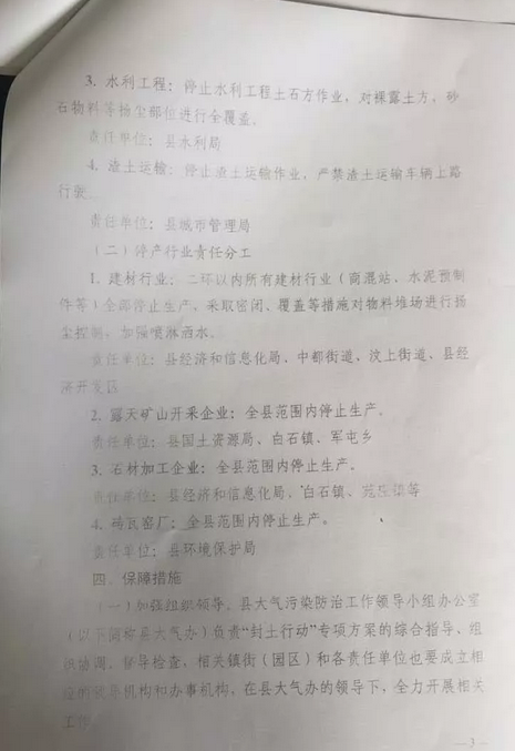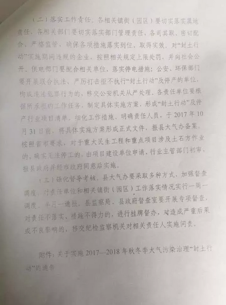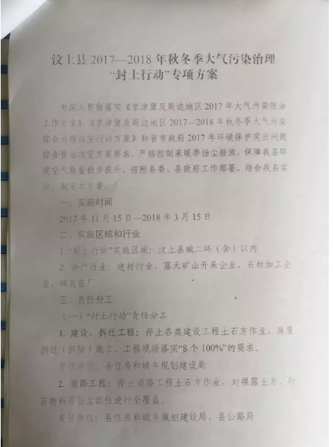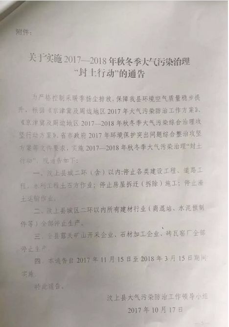 據(jù)悉,2017年10月17日汶上縣大氣污染防治工作領(lǐng)導(dǎo)小組下發(fā)了《汶上縣2017-2018年秋冬季大氣污染治理“封土行動”專項方 案》,方案要求全縣所有的花崗巖露天礦山、石材加工廠、磚瓦窯廠全部停止生產(chǎn),實施日期為2017.11.15-2018.3.15。