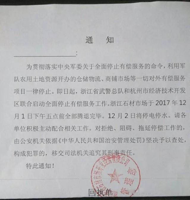 為貫徹落實中央軍委關于全面停止有償服務的命令,利用軍隊農用土地資源開辦的倉儲物流、商鋪市場等一切對外有償服務項目一律停止。即日起,浙江省武警總隊和杭州市經濟技術開發區聯合啟動全面停止有償服務工作。浙江石材市場于2017年12月1日下午五點前全部騰退完畢。12月2日將停電停水。請各單位積極主動配合相關工作。對拒絕、阻礙、拖延停償工作的,由公安機關依據《中華人民共和國治安管理處罰》堅決予以查處,構成犯罪的,移交司法機關追究其刑事責任。