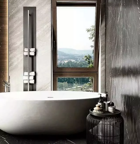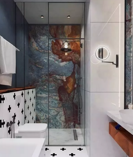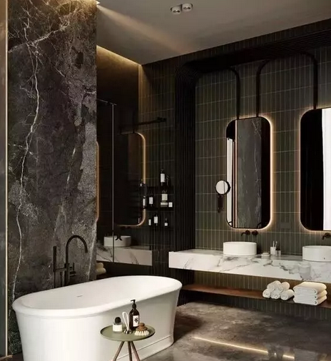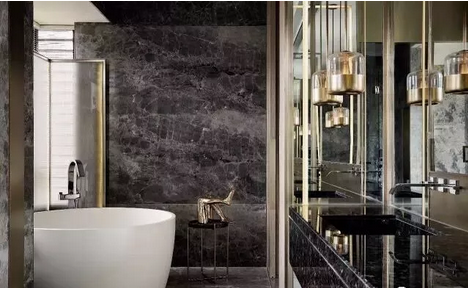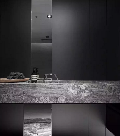 深色大理石則給人一種沉穩內斂且簡約利落的視覺享受。這種色系的運用包容性很強,既能彰顯自己的大氣,又能包容且襯托出其他色彩的出眾,在浴室中的運用能撫平一日中的浮躁,同時也彰顯出主人高雅獨特的氣質。