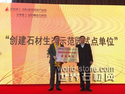 中石協授予成都建工國際石材園“創建石材生態示范園區試點單位”牌匾