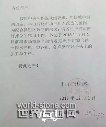 按照中央環保巡視組要求,加快城中村的改造,半山石材市場已列入改造的范圍,為配合拱墅區政府的部署;請各租戶提前做好攤位的騰退工作,務必于2018年1月1日前將市場攤位全部清退完畢;屆時將會統一停水停電,望各租戶務必安排好手頭上的加工與生產。