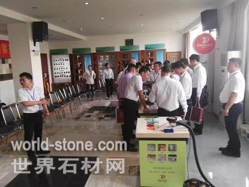 隨后,考察團在新易豐實操教室,現場體驗了石材日常保養“一磨一拋系統”。此外,新易豐技術中心向考察團介紹了部分常用的石材清潔材料,如何解決石材膠油污染、色素污染、石材失光等問題,并重點介紹了“石材局部拋光”工藝、“墻面石材拋光”工藝、“異形石材拋光”工藝和“無塵研磨系統”。