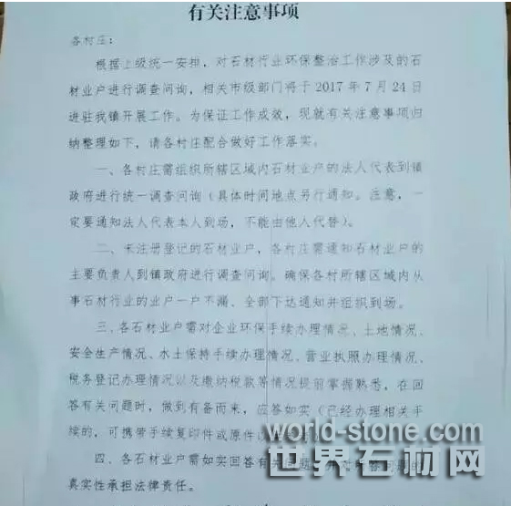 各企業(yè):接到通知,明天中央環(huán)保部門將到白石視鎮(zhèn)察工作,重點(diǎn)是檢查石材行業(yè),檢查路線和時(shí)間還未確定?,F(xiàn)通知明天所有石材企業(yè)和礦山暫停生產(chǎn),并保持衛(wèi)生干凈,迎接檢查。白石鎮(zhèn)政府•7月20日,預(yù)計(jì)停產(chǎn)10天。