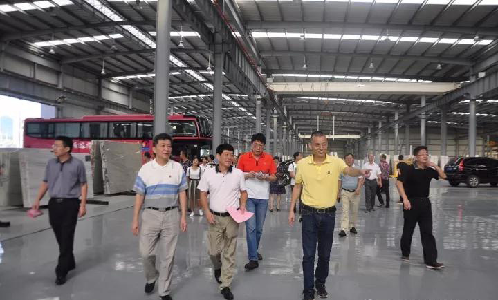 劉耀寧一行先后實地考察了康利集團、東星奢石館、鵬翔崗石、英良五號館。通過現場查看、聽取講解、查閱資料等方式,對水頭鎮石材企業的生產經營、生產工藝、廢渣處理以及技術設備使用等相關情況進行全面詳細了解。每到一處,雙方都相互探討、相互交流、相互學習,借鑒發展經驗。劉耀寧主席對水頭鎮石材產業的發展表示充分肯定,并表示,賀州與南安水頭各有所長,希望發揮各自的優勢進一步合作、交流、學習,共同發展。
