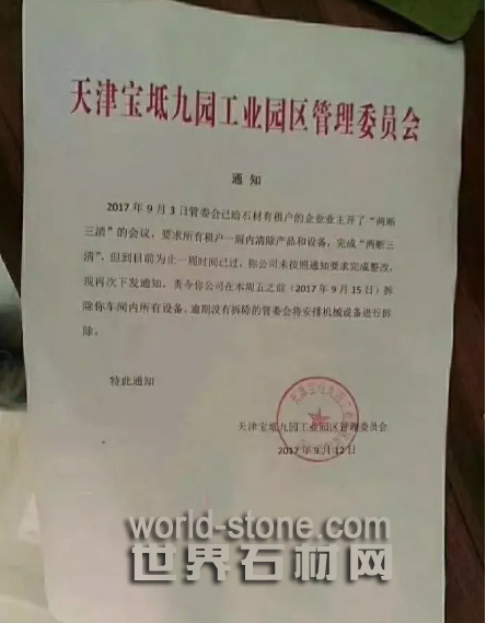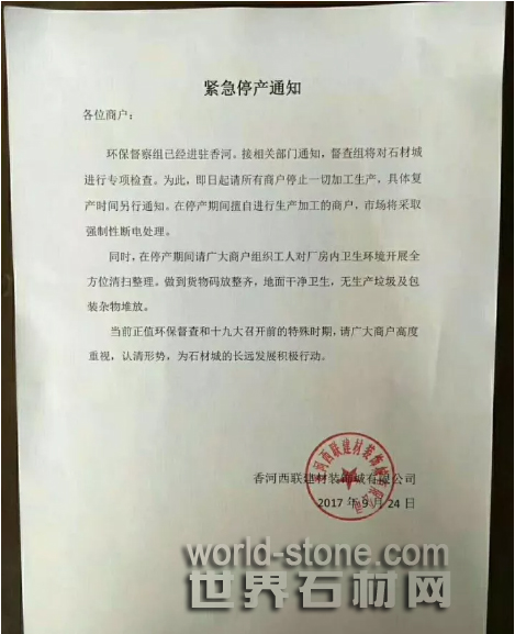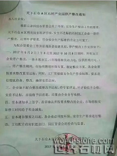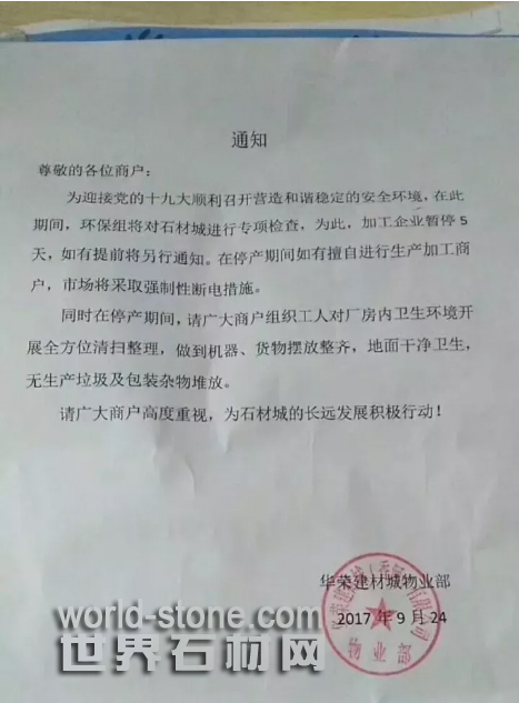 2017年9月2日上午8點至2017年10月8日期間,所有加工企業停產整改,一律不準加工。(市場將斷供動店里,僅供照明用電)。