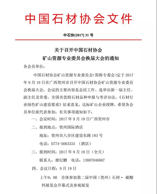 2017年9月19日,中國(guó)石材協(xié)會(huì)礦山資源委員會(huì)換屆大會(huì)將于廣西賀州召開(kāi)。