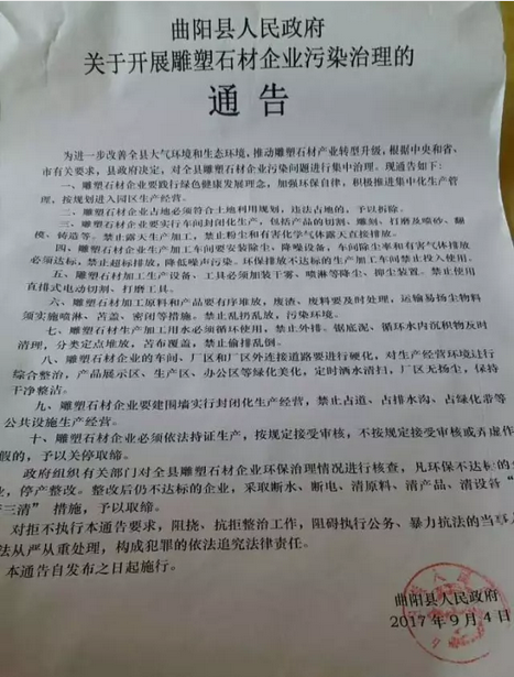 為進一步改善全縣大氣環境和生態環境,推動雕塑石材產業轉型升級,根據中央和省、市有關要求,縣政府決定,對全縣雕塑石材企業污染問題進行集中治理。現通告如下: