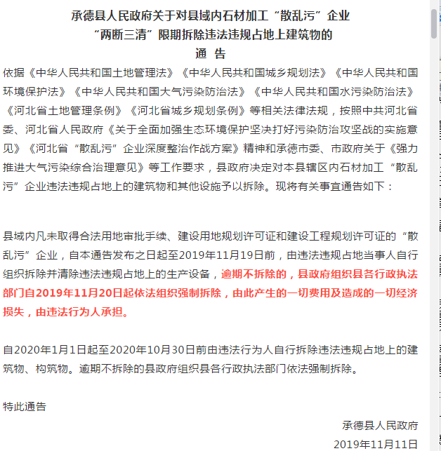 另一方面,針對預期而還未拆除的違規企業,縣政府責令當地執法部門人員自2019年11月20日開始,對這些企業實行強制拆除,因此產生的一切后果及費用全由企業行為人擔責。