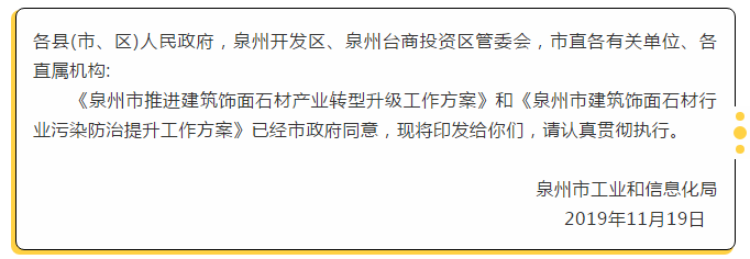 方案為《泉州市推進建筑飾面石材產業轉型升級工作方案》和《泉州市建筑飾面石材行業污染防治提升工作方案》,該方案已經市政府同意,現將印發給到下面相關部門,要求貫徹落實。