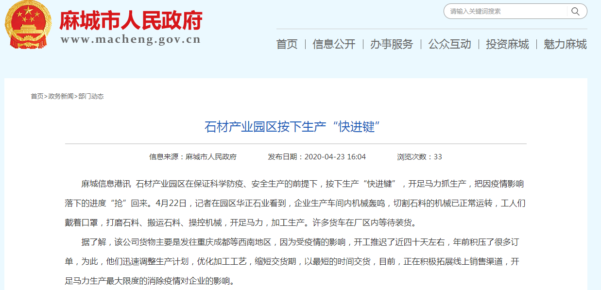 麻城市人民政府最新消息:石材產(chǎn)業(yè)作為麻城發(fā)展的支柱產(chǎn)業(yè)之一,近幾月來受到疫情的影響,已經(jīng)停滯不前,不僅石材企業(yè)們急不可耐,市領(lǐng)導(dǎo)也是憂心不已。當(dāng)下,疫情已經(jīng)得到良好的控制,各地復(fù)工潮逐步開啟,麻城市也不甘落后,在科學(xué)防疫、安全生產(chǎn)的前提下,麻城石材產(chǎn)業(yè)園“快進(jìn)鍵”已然啟動(dòng)。
