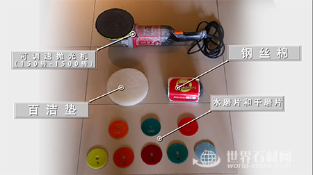 準備工具如下:可調速拋光機(150轉-1500轉),百潔墊,鋼絲棉,水磨片和干磨片。