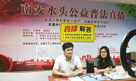 隨著疫情進入平緩期,各地開始爭先恐后的開啟復工復產。5月29日下午,為迎合復工復產要求,存進企業健康發展,防范勞動用工的法律風險,南安市水頭鎮總工會、南安市司法局水頭分局、南安市石材行業公共法律服務工作室聯合舉辦石材企業復工復產公益普法視頻直播活動,通過網絡視頻、直播平臺開展公益普法宣傳“云課堂”,把普法工作送到石材人的手機端,普及醫療互助和工傷調解知識,助力企業復工復產。