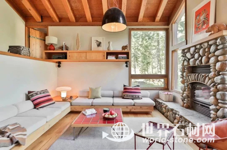 未經(jīng)過細(xì)致打磨的石材與實(shí)木搭配組合,則有一種自然、原始之美。很多小木屋就是以木為梁,原石做墻,居于其中,能感受到原生態(tài)的美感。