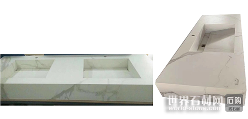 如圖上這種用膠粘接制作臺面板內腔的做法是有很多問題的。一是時間長了,膠的性能下降或老化后粘接的板可能脫落;二是膠縫時間長了受到外界各種物質的作用,膠縫處會藏污納垢,不僅影響產品美觀,膠縫處還可能出現滲水或漏水現象。所以,洗手臺的內腔要用石材加工,用荒料加工成整體的,避免上述問題的發生。若巖板加工企業還在制作這種用板材粘接的洗手臺面板,可得謹慎了!