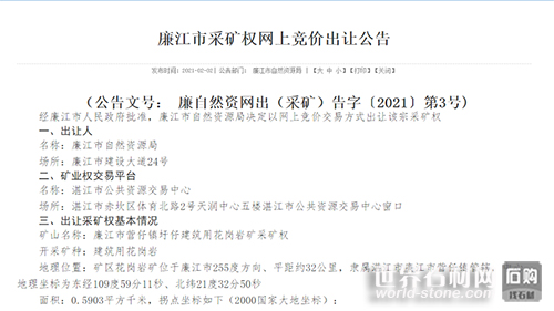 廉江市出讓一花崗巖采礦權, 2266.15萬元起拍!