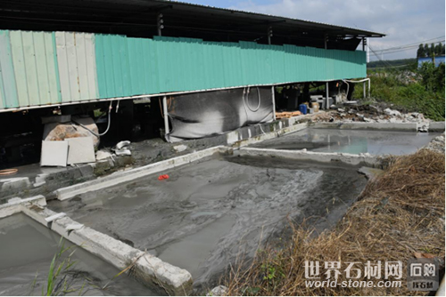 記者走進廠區后面,發現農田被回填的跡象。更為嚴重的是,該廠沒有裝備排污系統,加工產生的粉塵和廢水直接排放到農田、水塘,污染地下水,造成多畝農田荒棄(農作物佐證)。同時,該石材加工行沒有采取任何防塵舉措,產生