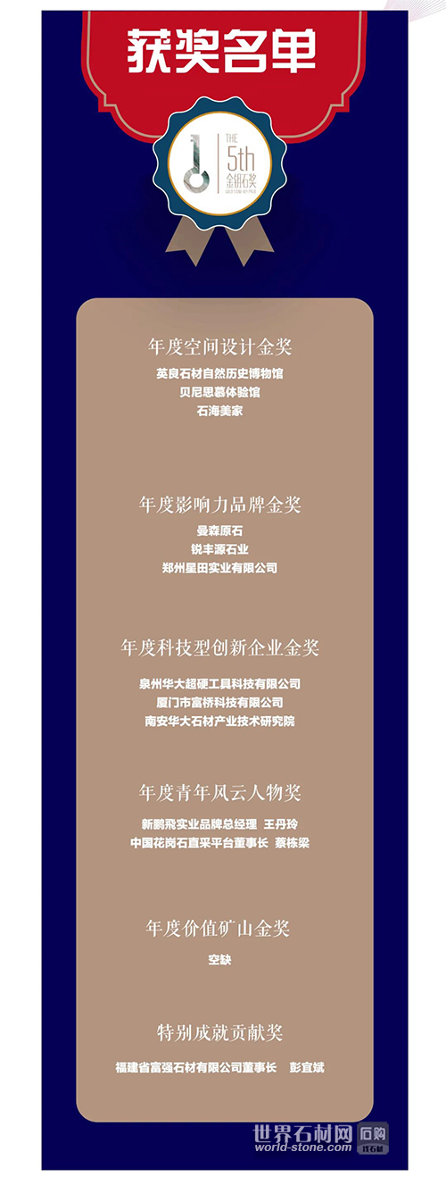 自第五屆金鑰石獎項評選發(fā)布以來,就受到了數百家企業(yè)的投稿參評。好事多磨,經過評選組委會的評選,這場席卷整個石材屆的年度盛事——金鑰石獎的最終得主,現在揭曉答案。