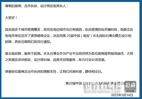 決定將第22屆中國(guó)(南安)水頭國(guó)際石博會(huì)暨石設(shè)計(jì)周延期,具體日期我們將另行通知。具體通知如如下: