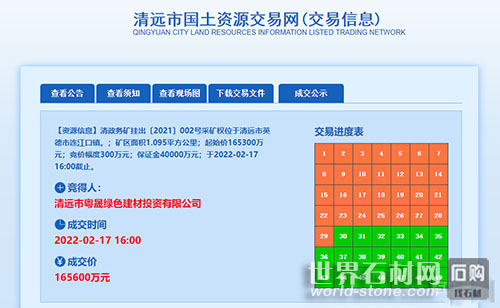 清遠市粵晟綠色建材投資有限公司以16.56億元的價格成功競得該采礦權。