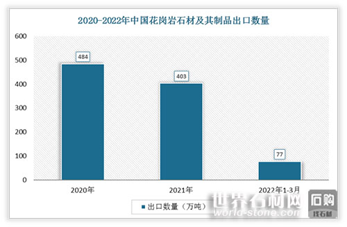 據有關數據限制,2022年前三個月,中國中國花崗巖石材及其制品出口數量為77萬噸,相較于2021年1-3月花崗巖石材及其制品出口數量82萬噸,我國花崗巖石材及出口數量下降了5萬噸,同比下降了6.1%。