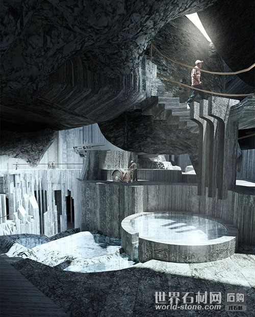 還有一位設(shè)計(jì)師在卡拉拉溫泉浴場(chǎng)的比賽中,以“流失的風(fēng)景”為主題,在采石場(chǎng)的空隙中規(guī)劃了一個(gè)溫泉,通過極簡(jiǎn)主義的設(shè)計(jì)語(yǔ)言使人與自然產(chǎn)生對(duì)話。