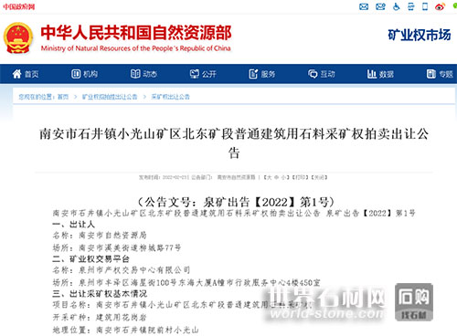 在4月底,福建省泉州市南安市自然資源局發(fā)布公告,通過拍賣出讓南安市石井鎮(zhèn)小光山礦區(qū)北東礦段普通建筑用石料采礦權(quán)。該礦權(quán)基本情況:位于福建省泉州市南安市石井鎮(zhèn)院前村小光山,面積0.8955平方千米,開采標(biāo)高186米至45米;礦區(qū)范圍內(nèi)建筑用石料開采儲(chǔ)量4442.51萬m3,設(shè)計(jì)生產(chǎn)規(guī)模500萬m3/年;出讓年限為9年;起始價(jià)4.14億元。