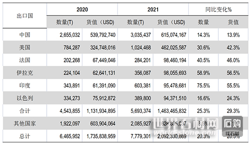 在2013年創下了歷史記錄,貨值為22.25億美元。在2021年,土耳其石材出口增長的主要原因是高附價值產品份額的增長。美國、法國、伊拉克和以色列是其出口主要市場,2021年,土耳其對美法等四國的出口額同比分別增長了42.27%,45.98%,56.54%和24.32%。中國和印度則是土耳其荒料出口的主要市場,2021年,土耳其對中、印石材出口額同比分別增長了13.95%和55.53%。荒料約占土耳其石材出口量的46%,出口額的1/3。