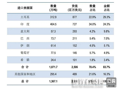 從世界主要石材供應國公布的數據來看,中國無疑是買家中無可爭議的大魚。“為中國制造”(Make for China)仍然是全球主要石材供應國的信條,盡管目前這還只適用于石材荒料。從終端市場來看,