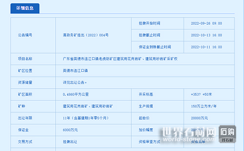 該礦權評估利用資源儲量建筑用花崗巖礦資源儲量1003.25萬立方米,生產規(guī)模:150萬立方米/年,出讓年限:11年(含基建期1年零5個月),起始價為人民幣20000萬元。