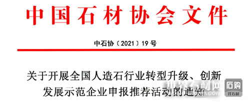 為了總結成功經驗,宣傳“十三五”期間在人造石行業轉型升級、創新發展方面作出表率的會員企業,樹立標桿,進一步推動行業健康有序、高質量發展,中國石材協會于2021年8月發出“關于開展全國人造石行業轉型升級、創新發展示范企業申報推薦活動的通知”,旨在對對符合要求的優秀企業給予表彰鼓勵。