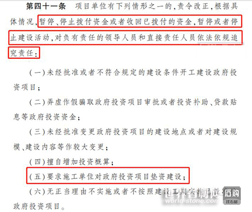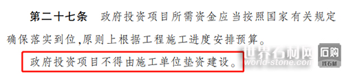 其中明確:政府投資項目不得由施工單位墊資建設。