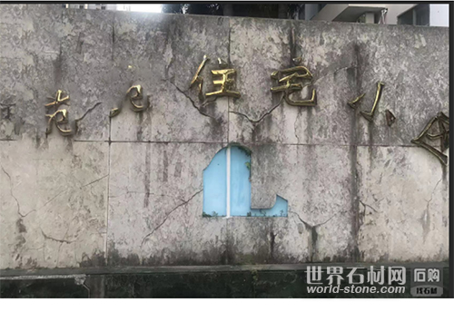 例如一家住宅小區(qū),采用了天然大理石金花米黃與大花綠做的小區(qū)標識牌,因為歷經(jīng)了20年的風(fēng)雨已經(jīng)破敗不堪,表面“開滿”了裂紋了,長滿了霉斑、黑斑及不知名的臟物了,若不走進仔細辨認,根本看不清是什么石材了。除此之外,這石材還發(fā)生了嚴重的變形;基座大花綠在外力的作用下已經(jīng)被擠離了面板至少10mm,不忍直視。