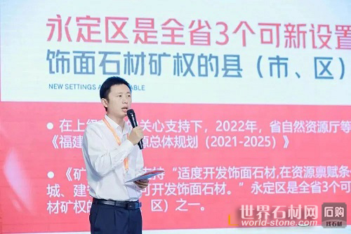 鉚釘目標,化壓力為動力,積優勢為勝事,才能實現發展的大目標。龍巖市永定區委副書記 蘭光上臺,為各位來賓全方位展示了永定新風貌。他介紹表示,“永定紅”礦區是福建省花崗巖資源整體性最好且品質較優的礦區,開采歷史悠久。立足良好的園區資源、先進的工藝、完善的循環產業鏈以及低碳環保的四大優勢,永定紅礦區將緊扣“紅色石材、綠色開采”思路,全力打造綠色礦山,為石材產業發展貢獻一份力量。