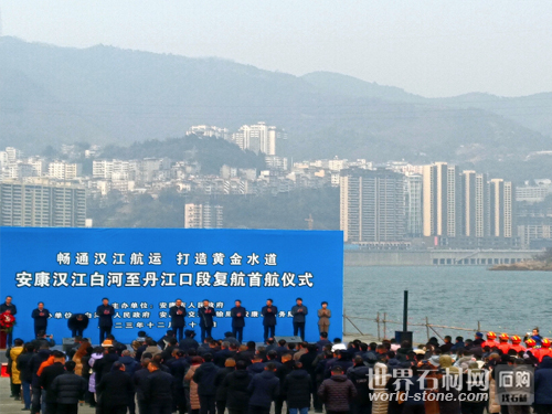世界石材網獲悉,12月21日上午9時,陜西安康漢江白河至丹江口段“黃金水道”復航首航儀式在安康市白河縣下卡子貨運碼頭隆重舉行 ,伴隨著一聲長笛鳴響,“鄂鄖西貨0008”滿載石材順江而下,駛向湖北丹江口。