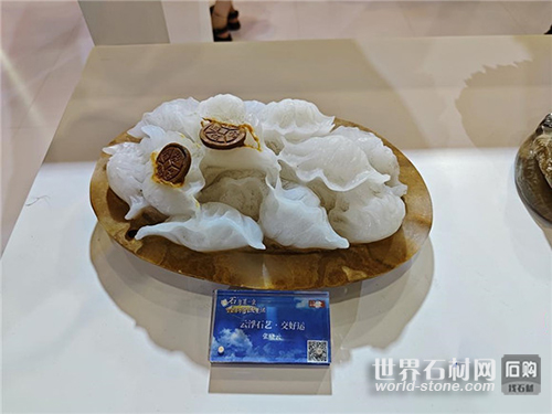 餃子這個作品是以家鄉習俗創作而來,每逢新春都會包餃子,同時放幾個硬幣,代表著父母對子女的愛和祝福,吃到硬幣的餃子,好運連連、出人頭地。荷蘭豆與荷包的荷字同字同音,寓意荷包飽滿,財源廣進。腸粉是廣東特色美食之一,也是廣東人日常生活中必不可少的一道美食,貼近生活。以嶺南佳果為主題,利用玉石的天然色彩及天然造型,將黃玉部分雕刻為成熟的楊桃,深棕色的天然石皮雕刻竹編托盤,寓意云浮石藝及佳果碩果累累大豐收的同時,更寓意著云浮石藝的名聲遠揚。