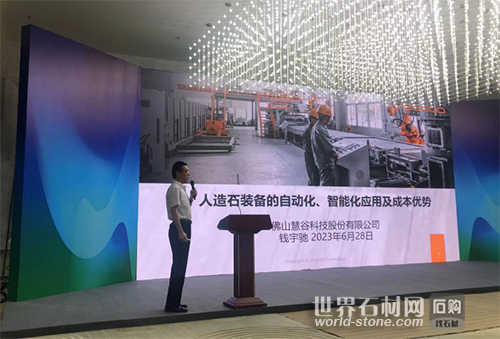 佛山慧谷科技股份有限公司董事長助理錢宇馳帶來的《人造石裝備的智能化、自動化應用及成本優勢》演講中,剖析了自動化、智能化的內涵,介紹了在企業提質增效中的巨大作用。