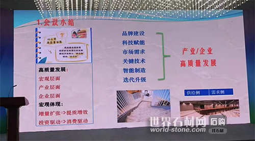 最后,中國石材協會秘書長孫衛星作為主持人進行會議小結,他指出,本次論壇的6個專家報告內容分別涉及:品牌建設、科技賦能、市場需求、關鍵技術、智能制造、迭代升級,它們的組合正是人造石行業高質量發展的有效路徑。借本次論壇機會,孫衛星還對“宜業尚品