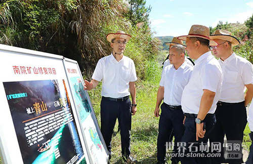 首先,在南院礦山生態修復項目現場,李劍鋒通過實地查看、聽取匯報,詳細了解該礦山生態修復、項目推進等情況。李劍鋒作出強調,礦山生態修復是一項重大的生態工程,屬地鄉鎮和相關部門要切實增強責任感和使命感,牢固樹立“綠水青山就是金山銀山” 的理念,將生態優先、綠色發展理念貫穿于礦山生態修復全過程,加快修復建設進度,切實提升治理成效;要以深厚、悠久的工礦文化為內涵,充分發揮南院當地石材資源豐富、開采加工技術精湛等優勢,因地制宜,打造有特色、有亮點的文旅項目,促進當地增收。