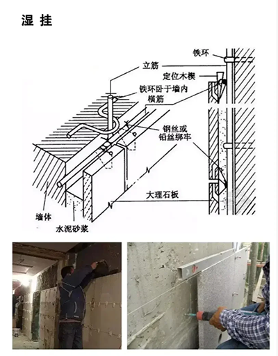 濕掛:指石材基層用水泥砂漿作為粘貼材料,先掛板后灌砂漿的石材安裝方法。濕掛的做法費工費料成本高、施工慢、會空鼓、反堿。