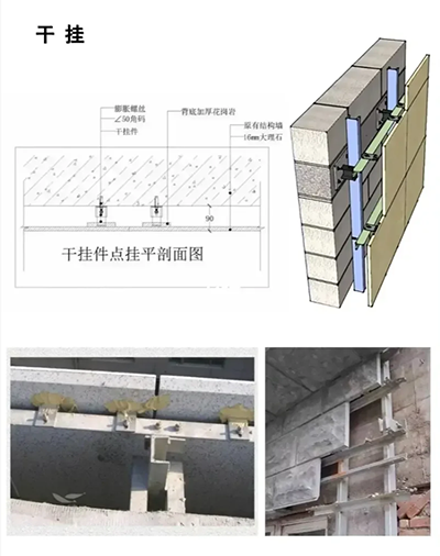 干掛:指基層搭接鋼架,與墻面產(chǎn)生結(jié)構(gòu)連接,再通過干掛件固定石材,就如上圖所示,干掛的做法,完成面較厚,比較浪費空間,多應(yīng)用于室內(nèi)大面積的石材安裝。造價較高。